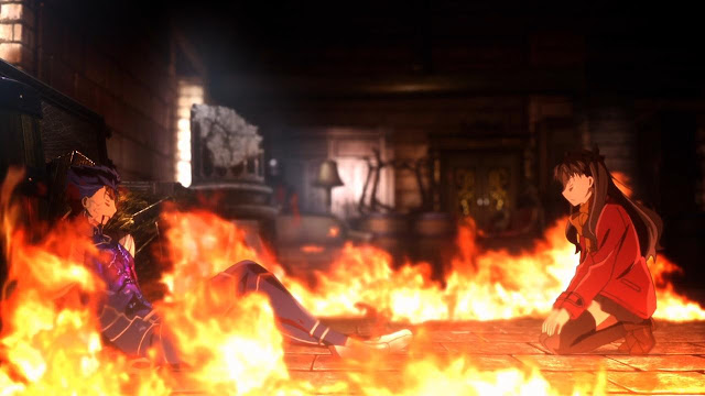 Pobre Lancer, quero uma 4ª rota dele sendo o servo da Rin. E essa cena ficou meio fria de novo, esse diretor tem um problema com cenas de gente morrendo que deveriam ser mais emocionantes (ele fica deixando a OST do background muda na maior parte do tempo). Fora isso, esse negócio do Lancer receber uma ordem para se matar e não cumpri-la direito (como o Lancer de Fate/Zero fez) ficou mal explicado. Ele cai, volta, salva a Rin, cai de novo, o Shinji aparece, ele levanta, da uma porrada no Shinji e ai morre. Ficou bem estranho.