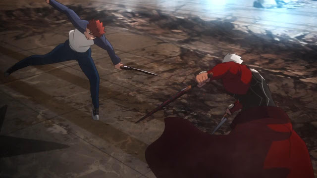 Uma obviedade da luta do Shirou x Dark Shirou que me agrada: o Shirou mirrado não pode derrotar um Shirou com mais de 100 anos de experiencia e toneladas de frango com batata doce na veia. E eu nem entrei no mérito dele ser um espirito heroico com atributos ainda, os golpes dele quebram o fucking chão com o impacto, tamanha a força (tudo bem que isso não tem no original, mas faz sentido). Felizmente isso parece ser abordado e o Archer mesmo fala que poderia ganhar a qualquer momento, mas estava exitante. Essa honestidade da luta foi boa.