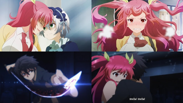 Outra coisa que gostei foi o Ikki correndo para abraçar a Stella no final. A Stella está claramente interessada nele e fica usando a desculpa do “serva”, que o protagonista claramente não gosta, como forma de justificar suas ações sem ter que admitir que gosta dele. Já o Ikki não tinha demonstrado grande coisa até agora, ao menos até esse final, aonde ele, além de ficar furioso com o que estava acontecendo a Stella, corre para abraçar ela no final em vez da irmã. Na Novel ele já tinha demonstrado um pouco mais de interesse nela antes, algo que o anime não mostrou, então estava preocupado que fossem cortar essa cena também, mas felizmente não.