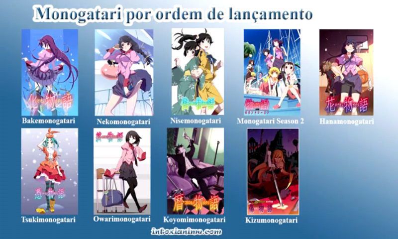Kizumonogatari; Nekomonogatari; Bakemonogatari; Nisemonogatari; Monogatari Series – Second Season; Tsukimonogatari; Owarimonogatari; Koyomimonogatari e por fim Hanamonogatari