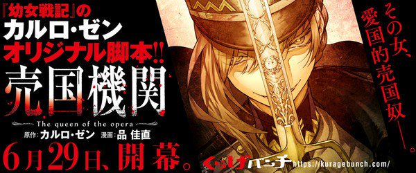 O site de mangás Kurage Bunch, da editora Shinchosha, vai começar a publicar um novo mangá escrito por Carlo Zen (Youjo Senki) e desenhado por Yoshinao Shina. O mangá, intitulado Baikoku Kikan (Treason Agency), será lançado online a partir do dia 29 de junho.