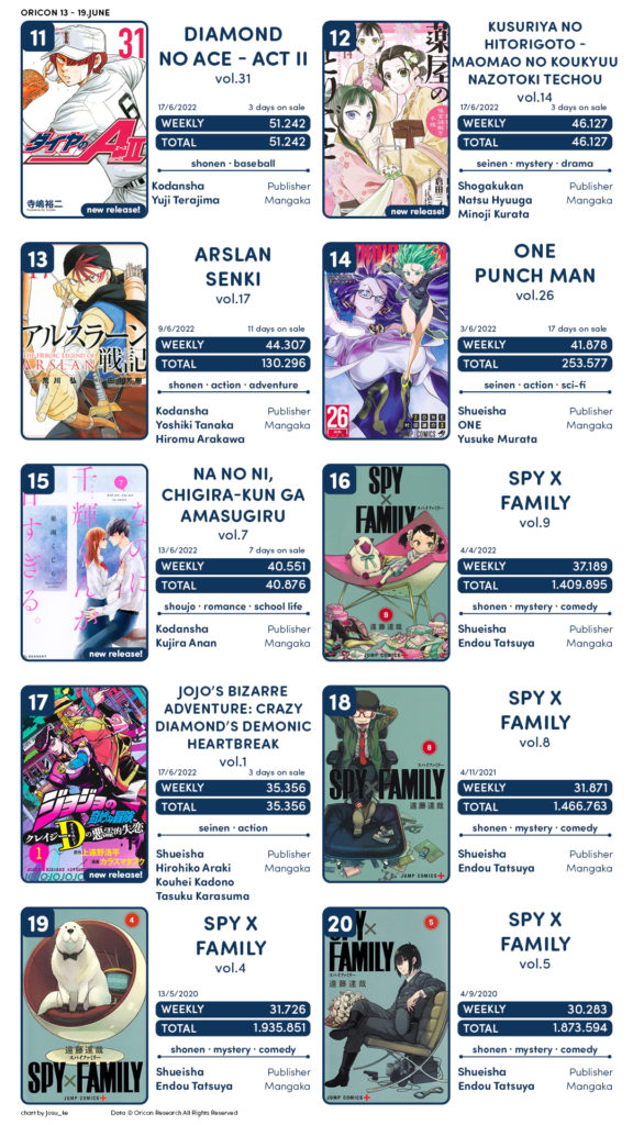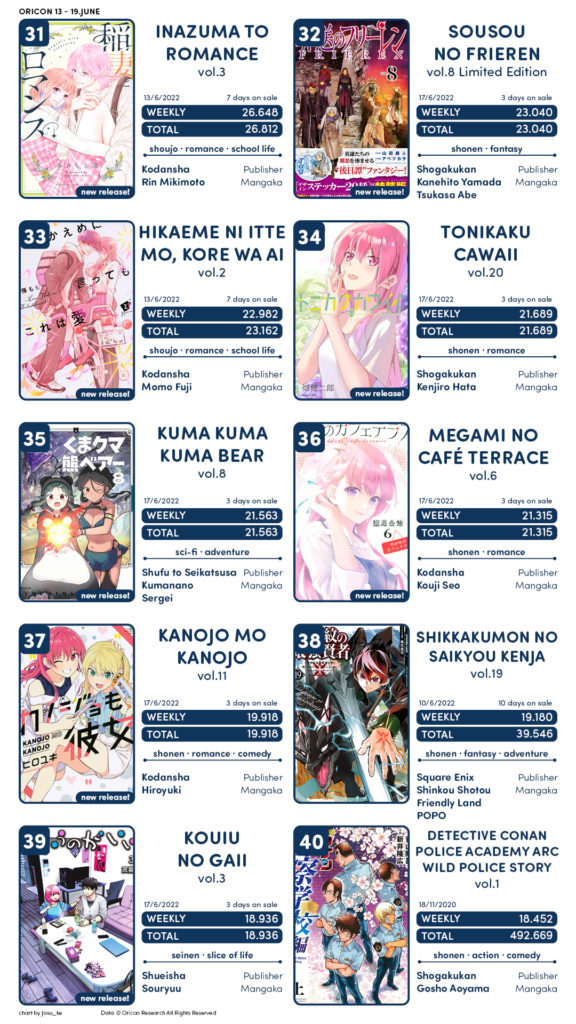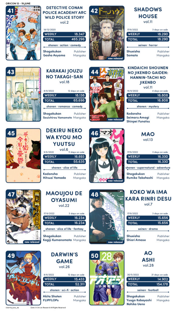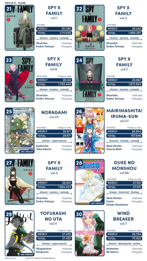 Semana com bastantes estreias, com o novo volume de Tokyo Revenger pegando o 1º lugar e sendo seguido por obras como Kingdom, Sousou no Frieren e Golden Kamuy . Kaguya-sama e Oshi no Ko o top 10.