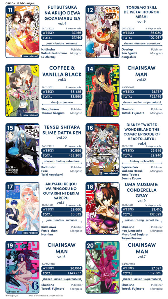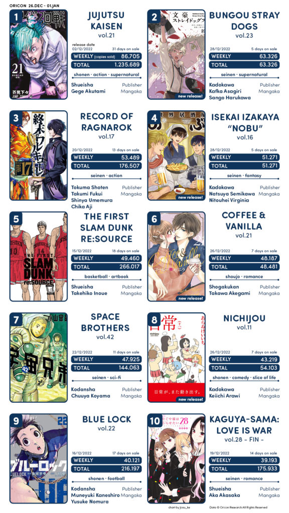 Semana sem muitas estreias, como novos volumes de Bugou Stray Dogs, Nichijou, Isekai Izakaya Nobu sendo os grandes destaque do top 10.