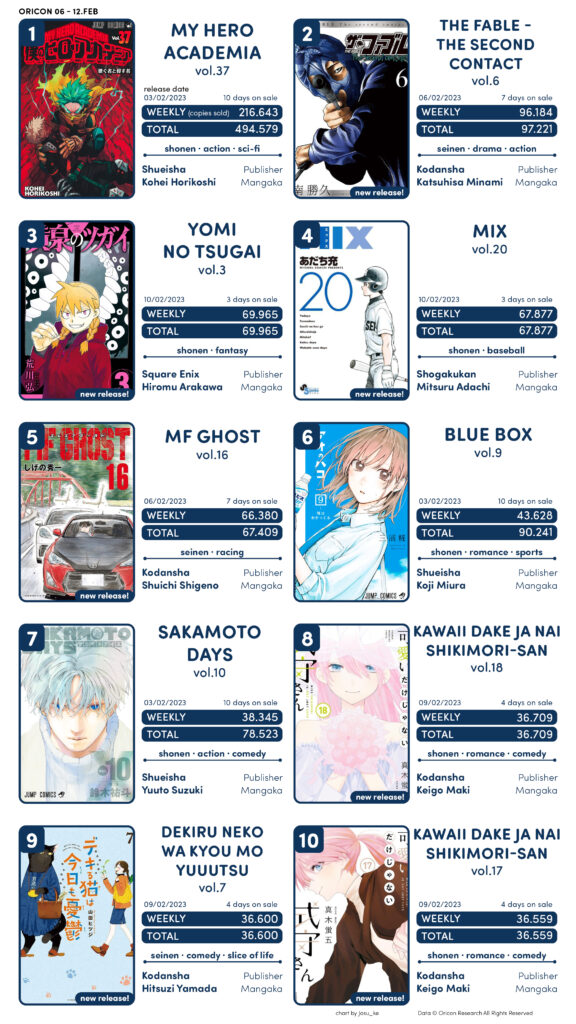 Semana com algumas estreias interessantes, com os 2 últimos volumes de Shikimori-san aparecendo dentro do top 10.