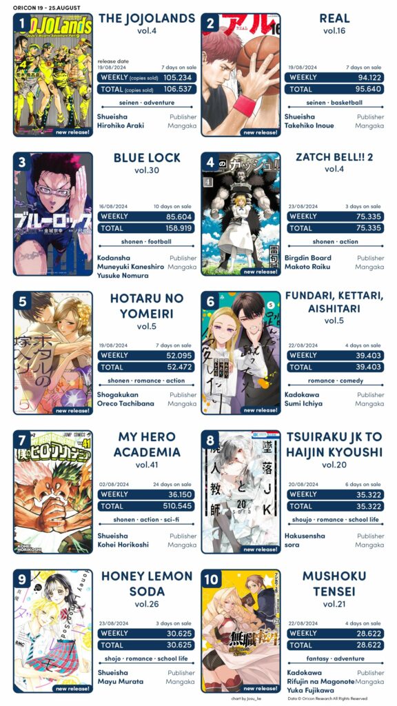 Semana com algumas estreias interessantes, com novos volumes para The JoJoLands, Zatch Bell!! 2, Honey Lemon Soda e Mushoku Tensei.