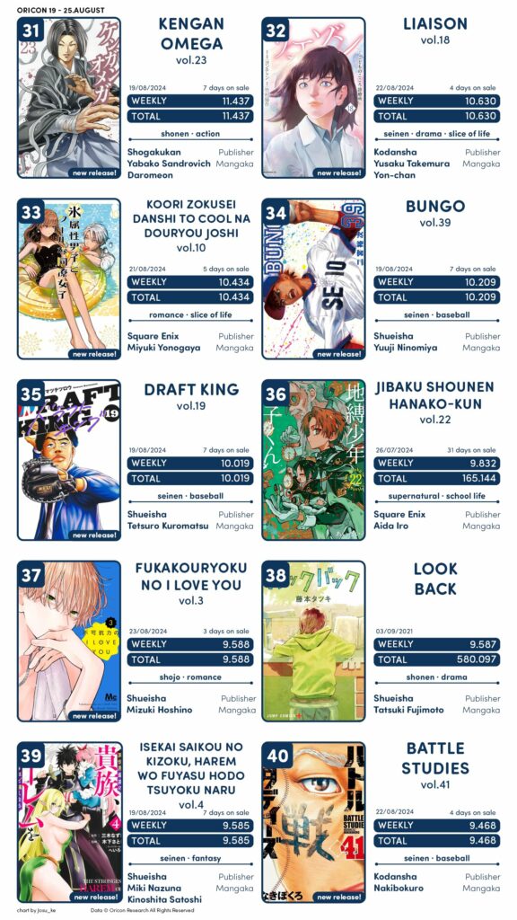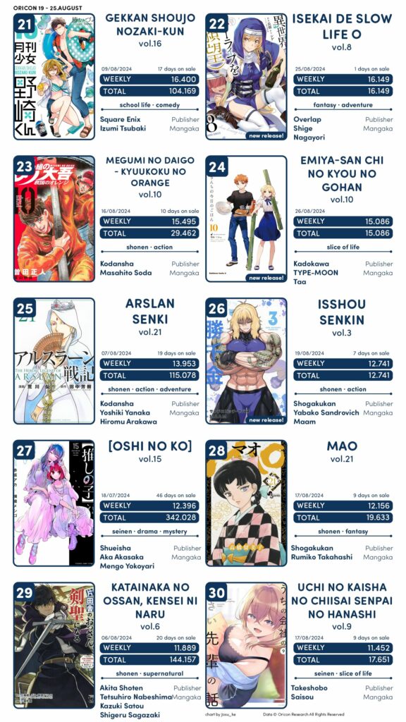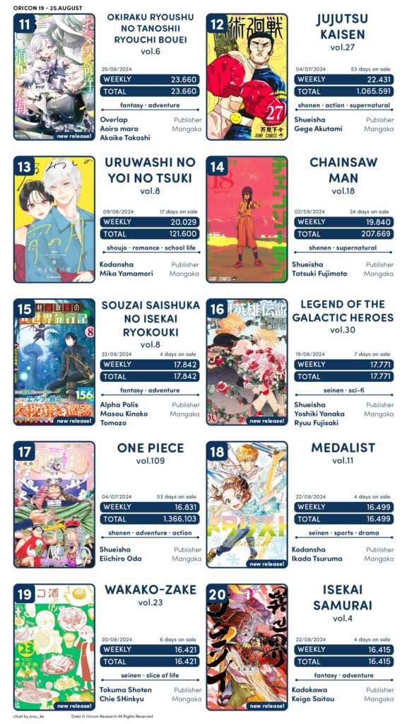Outras obras como Medalist, Isekai Samurai, Isekai de Slow Life wo, Emiya chi no Kyou no Gohan e Uchi no Kaisha no Chiisai Senpai no Hanashi também tiveram novos volumes.