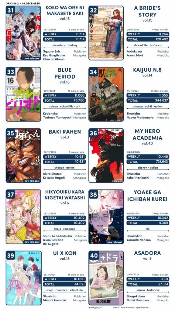 Semana com algumas das principais estreias da JUMP, com o último volume de Boku no Hero Academia aparecendo junto de Chainsaw Man, Kagurabachi, Ao no Hako e Nige Jouzu no Wakagimi.