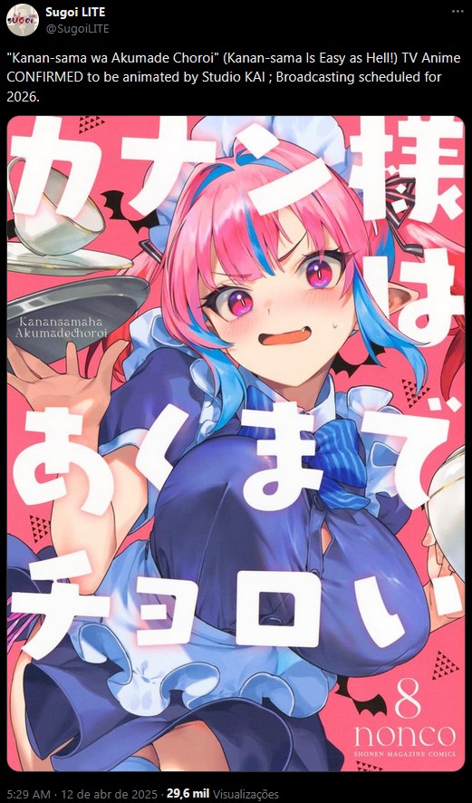 O Leaker Sugoi Lite confirmou que o mangá de Kanan-sama wa Akumade Choroi (Kanan-sama Is Easy as Hell!) irá ter uma adaptação em anime.