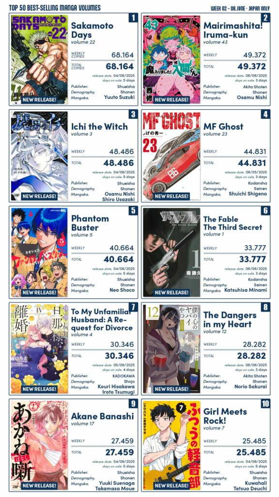 Semana com bastante estreias interessantes, com novos volumes para Sakamoto Days, Mairimashita! Iruma-kun, Boku no Kokoro no Yabai Yatsu, Phantom Buster, The Fable e Akanebanashi.