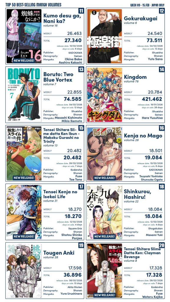 Semana com algumas estreais interessantes, com novos volumes para Tensei Shitara Slime Datta Ken, Mystery to Iu nakare, My Gift Lvl 9999 Unlimited Gacha, Tensei shitara Dainana Ouji e Kumo Desu ga Nani Ka?.