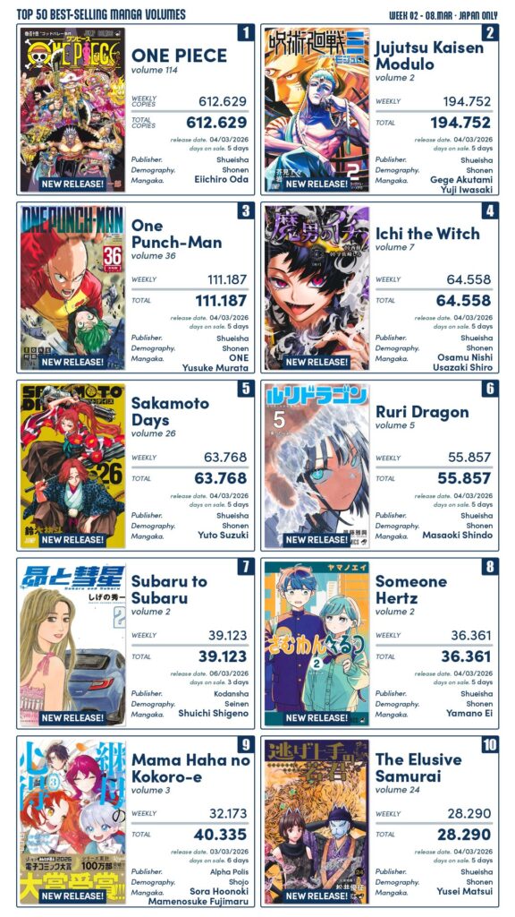 Semana com algumas das principais obras da JUMP, com novos para One Piece, Jujutsu Kaisen Modulo, One Punch-Man, Sakamoto Days, Ruri Dragon e Nige Jouzu no Wakagimi.